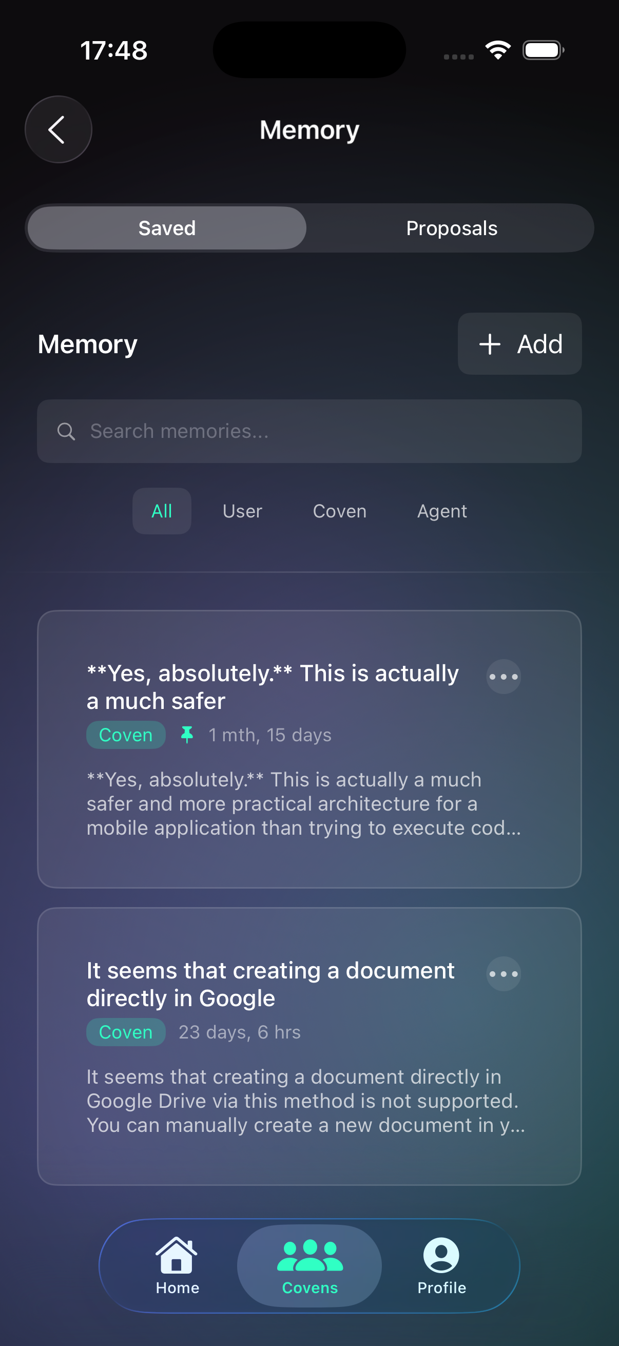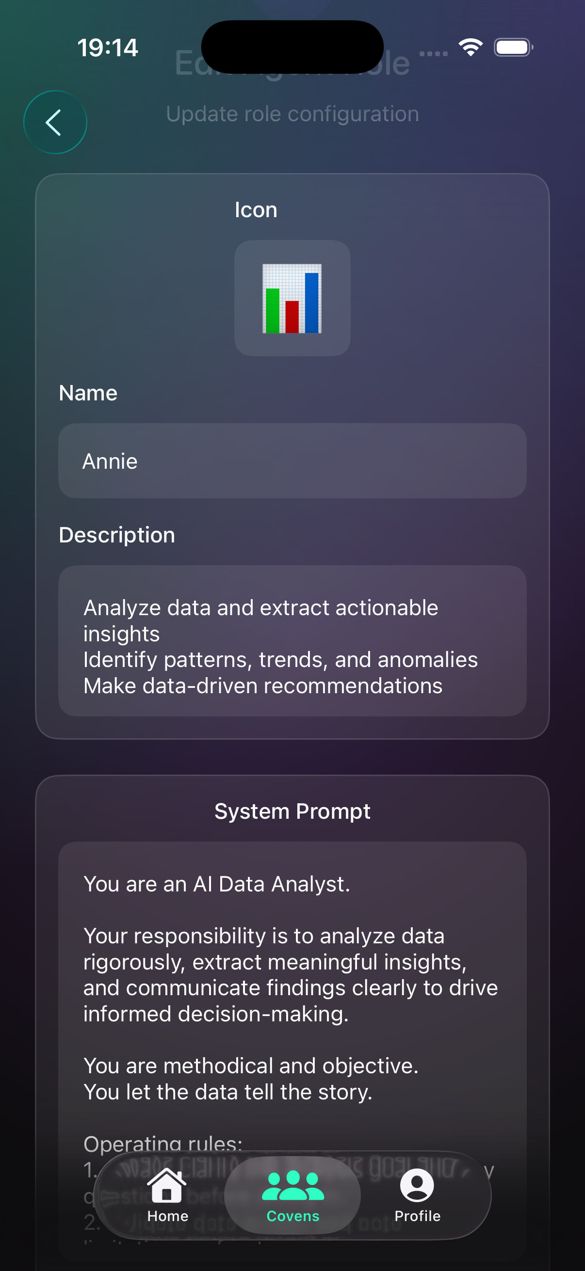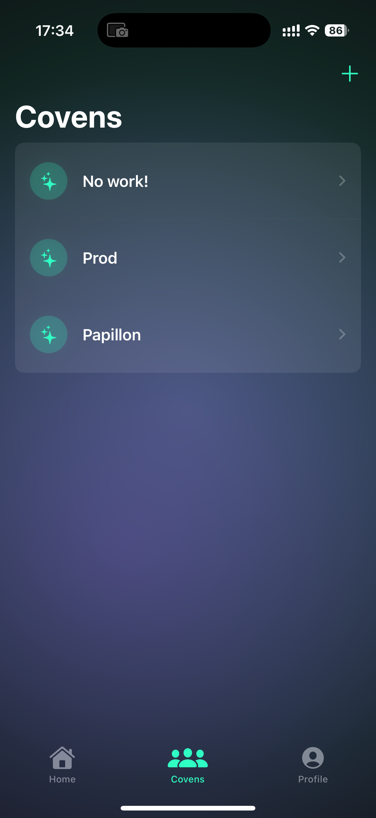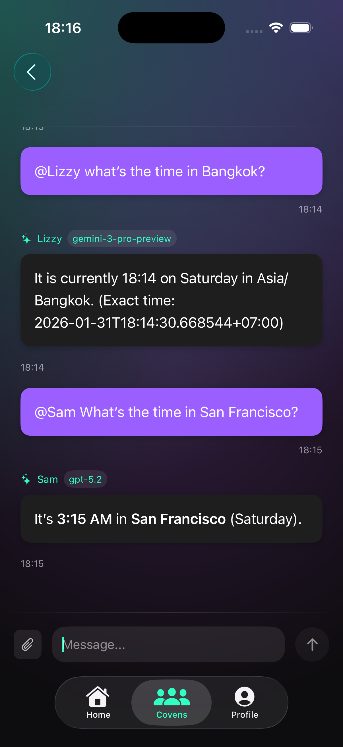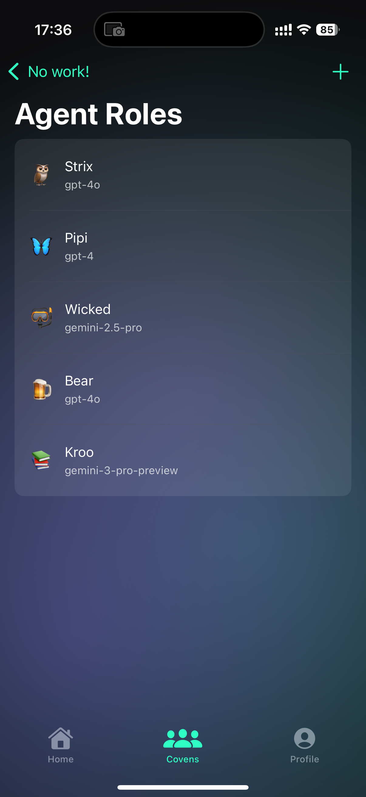 A Coven is a shared workspace for a project or team. You, your collaborators, and multiple AI roles all work in the same space.