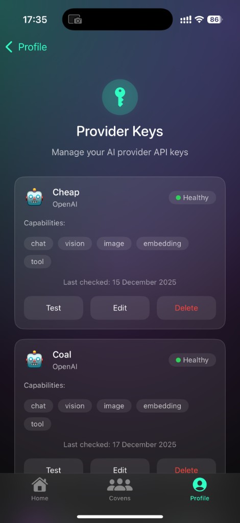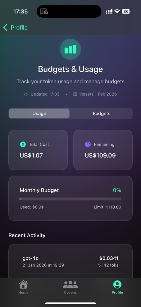 On Mac, iPad, and iPhone, the Swift client generates a unique 256 bit key per Apple account and stores it in the iCloud Keychain. That key never leaves your devices in plaintext. Before a chat request is sent, the app derives a Base64 representation of this key and sends it once per request in the X Coven Keyheader.